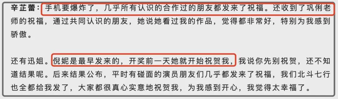 据悉,从获奖到现在回国,辛芷蕾的私信已经爆炸了,她表示几乎所有和自己有过合作的艺人导演都发来了祝福,甚至还有巩俐和周迅的祝福。不过要说最早发来祝福的,还是倪妮,只不过倪妮发的祝福有点太早了,当时还没公布获奖名单,倪妮就提前一天祝贺了,也算是神预言了一波。