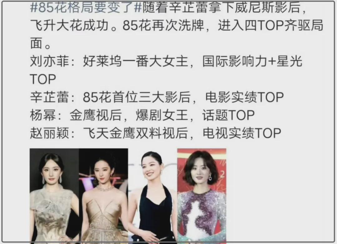 据悉,在辛芷蕾拿到影后没过多久,就有博主进行了一波分析,称85花的格局要变了,洗牌过后现在变成了刘亦菲、辛芷蕾、杨幂与赵丽颖,给这几位进行所谓的洗牌与排名,颇有点拉踩的意思。